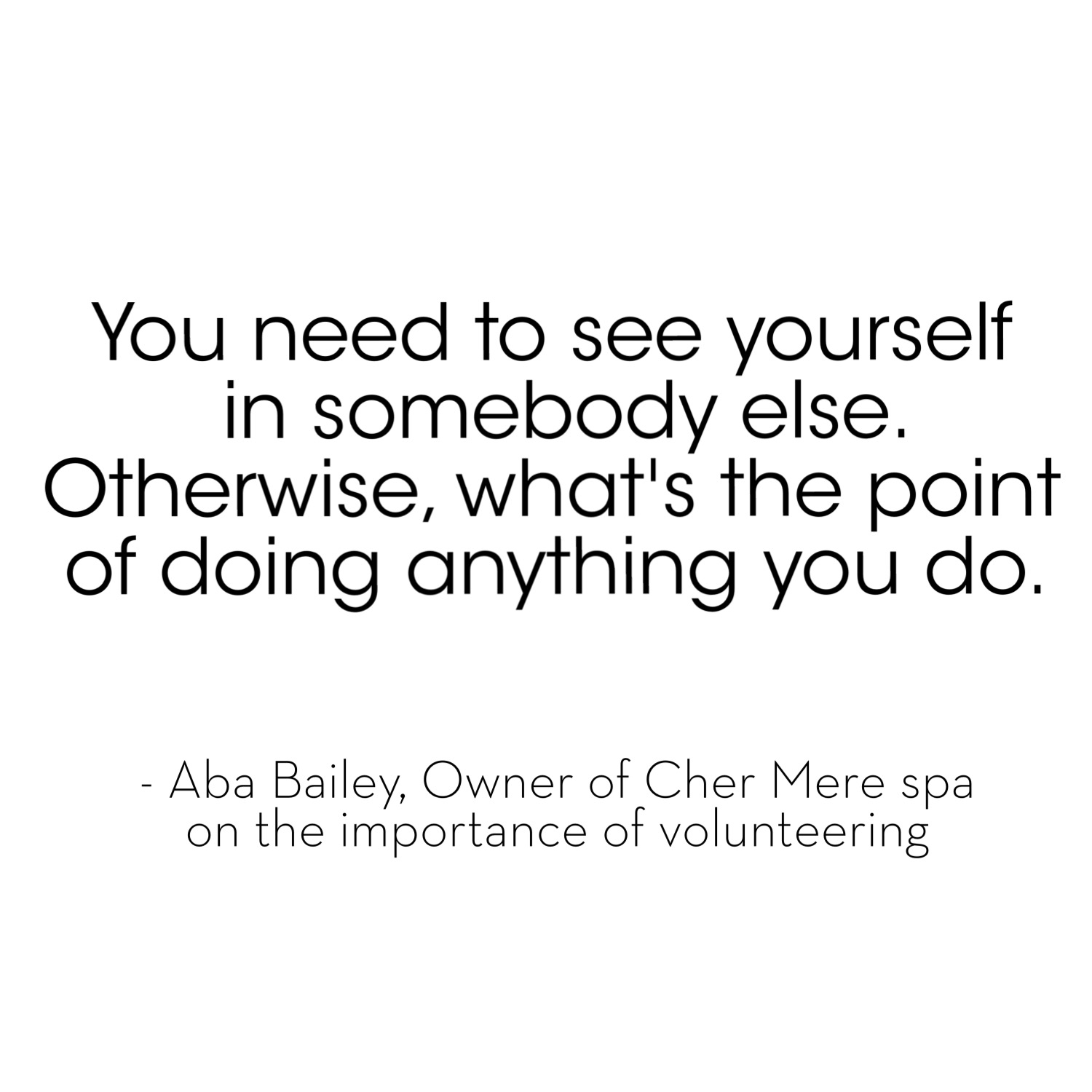 Aba is truly integrated in our community, volunteering for Youth Diversion as well as Hundred Women Who Care. When I sit down with her at Coffeeco she seems to know every other passerby and greets them with a wide grin and a “How are you?!”.