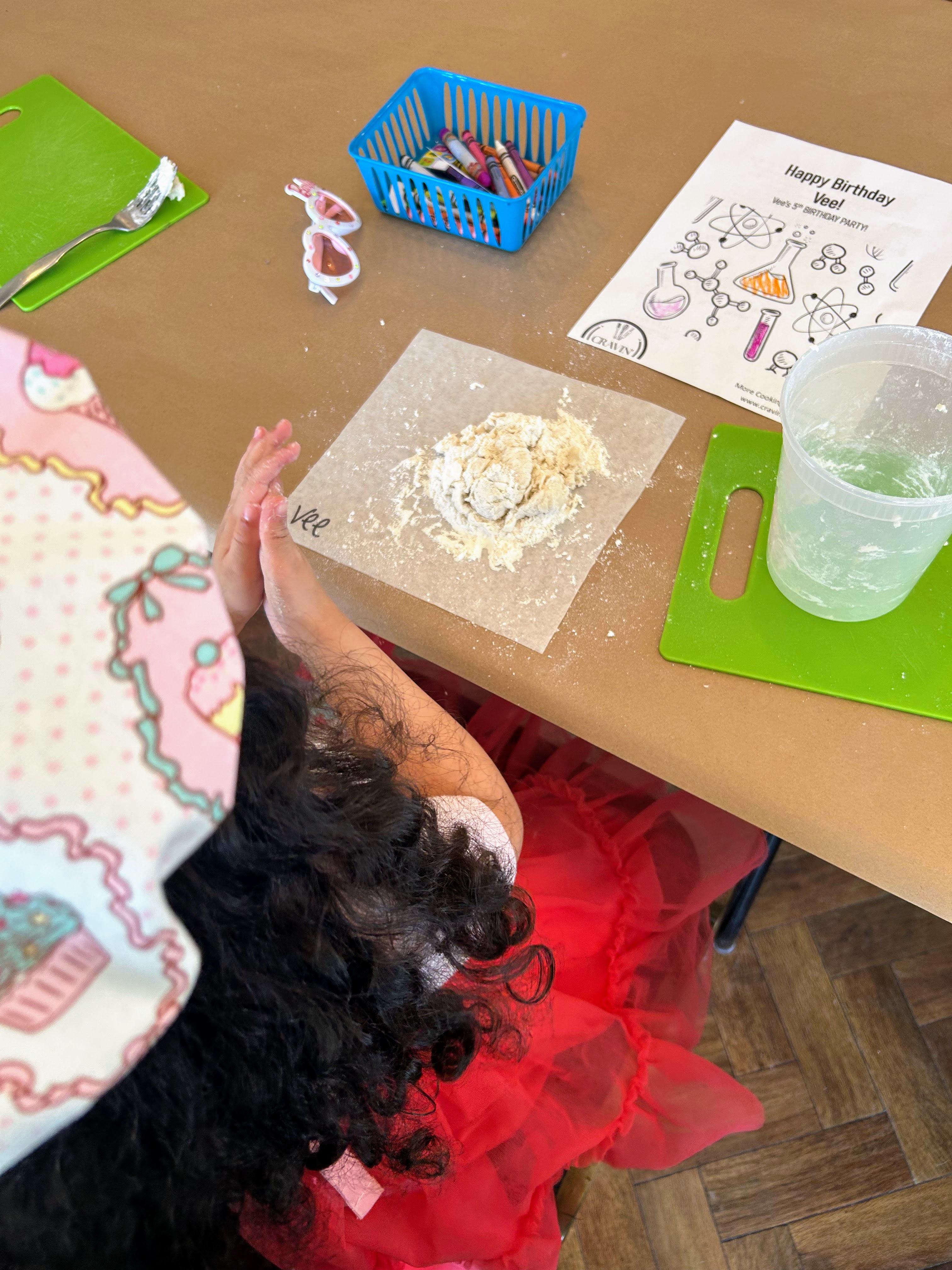 Party Day: When we arrive 30 minutes early on party day to set up a few Barbie decorations, the tables are set with colouring pages custom printed for my daughter’s special day with her name and the recipe for single serve pizza dough on the back. After a group trip to the bathroom to wash hands, Selena talked the kids through making and kneading their own dough, chopping their fillings, and stuffing their calzones seamlessly. While the calzones were in the oven, they talked about how baking involves science and made bubbles with baking soda and vinegar as well as a baking soda volcano. When the calzones were ready the kids actually ate them with a side of veggies (for those that couldn’t finish, she had to-go bags on hand!). They ended the class by decorating their choice of cupcake (chocolate or vanilla) and opening gifts. It was such a great day! Selena gifted the birthday girl a little bag of cake decorating accessories and a kids cutting tool.